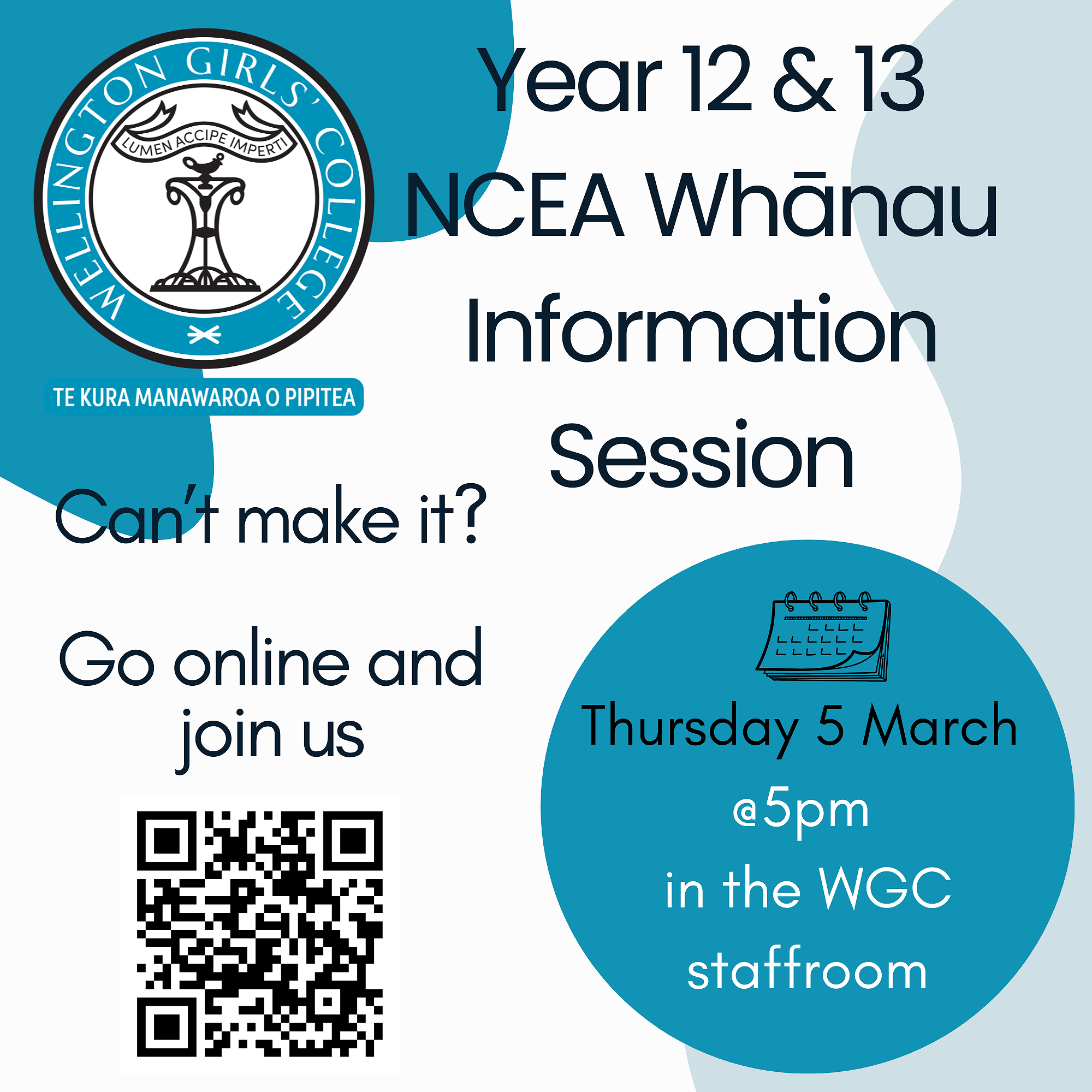 Join us for an NCEA information session on Thursday 5 March @5pm in the WGC Staffroom.